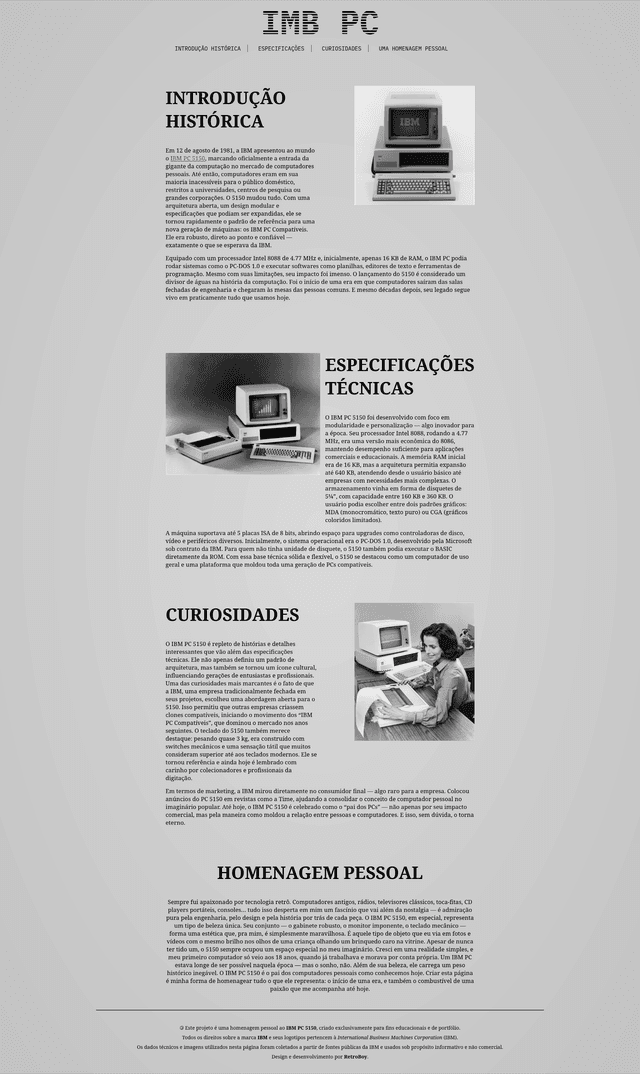 Landing page dedicada ao IBM PC 5150. Foco em identidade visual nostálgica com técnicas modernas de HTML e CSS.