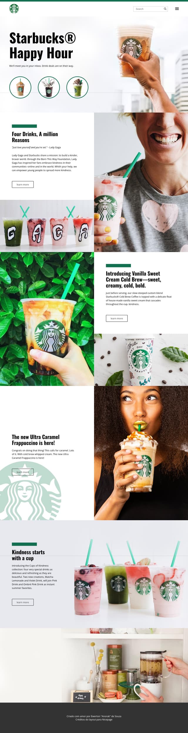 Modelo inspirado no site oficial da Starbuck. Aplicação prática de conceitos de layout, estilização avançada e responsividade.