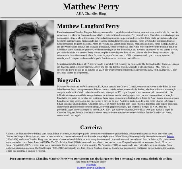 Página tributo em homenagem ao ator Matthew Perry. Projeto voltado para praticar tipografia, organização de conteúdo.