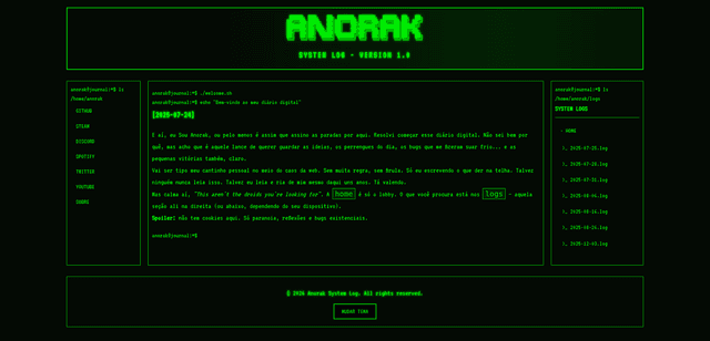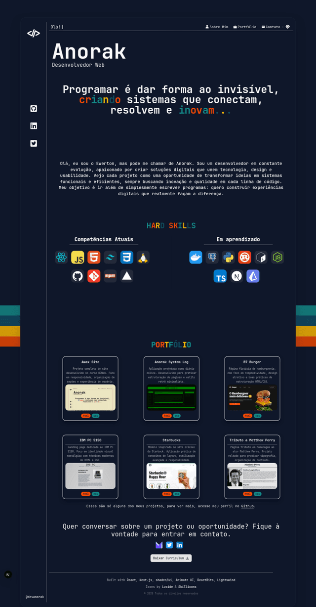 Olá, eu sou o Ewerton, mas pode me chamar de Anorak. Sou um desenvolvedor em constante evolução, apaixonado por criar soluções digitais que unem tecnologia, design e usabilidade. Vejo cada projeto como uma oportunidade de transformar ideias em sistemas funcionais e eficientes, sempre buscando inovação e qualidade em cada linha de código. Meu objetivo é ir além de simplesmente escrever programas: quero construir experiências digitais que realmente façam a diferença.